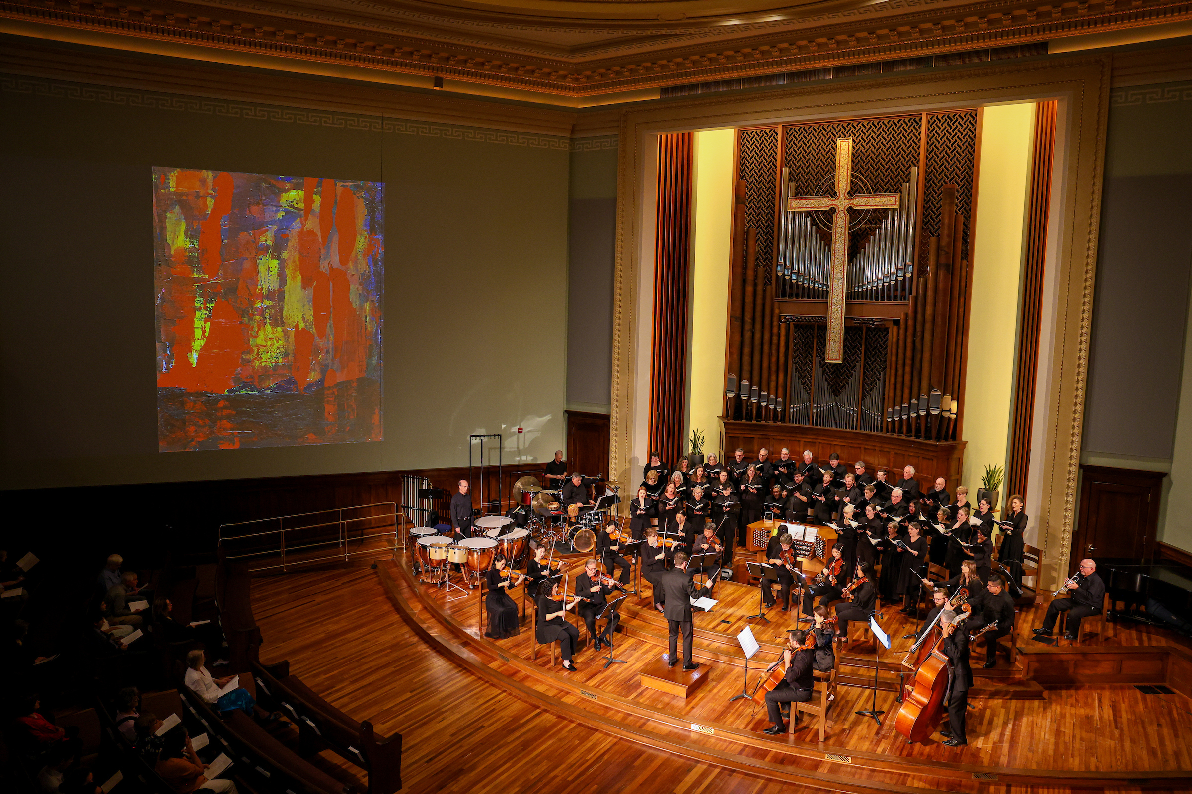 In addition, the chancel choir has performed several major works in concert, complete and excerpted. Most recently, the Chancel Choir performed Karl Jenkins’ The Armed Man: A Mass for Peace with members of the Dallas Symphony Orchestra, accompanied by original artwork commissioned for the performance.
